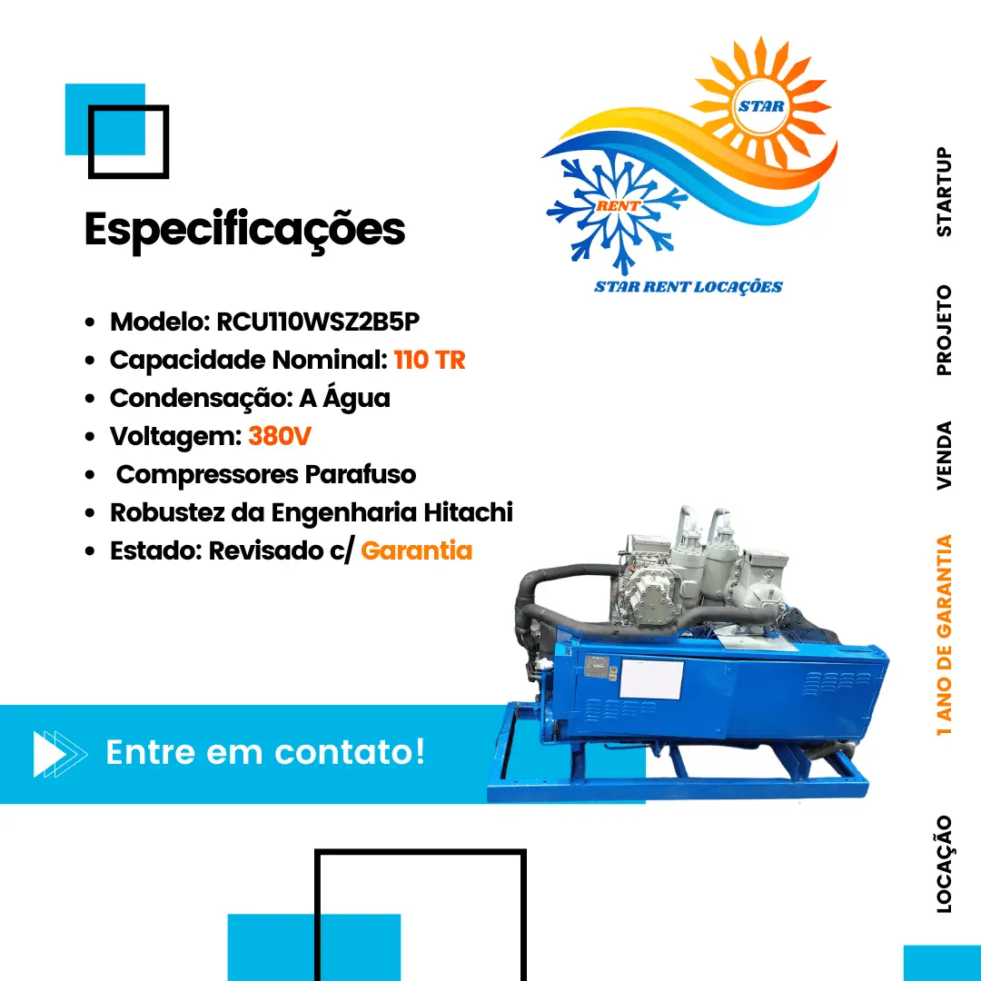 Estabilidade térmica absoluta para processos industriais exigentes. O Chiller Hitachi 110 TR (RCU110WSZ2B5P) entrega a reconhecida robustez da tecnologia japonesa, sendo a escolha perfeita para indústrias que não podem lidar com oscilações de temperatura em suas linhas de produção. Esqueça os longos meses de espera por equipamentos importados: a Star Rent tem esta máquina 100% revisada e em estoque, pronta para ser despachada e garantir a continuidade da sua operação.