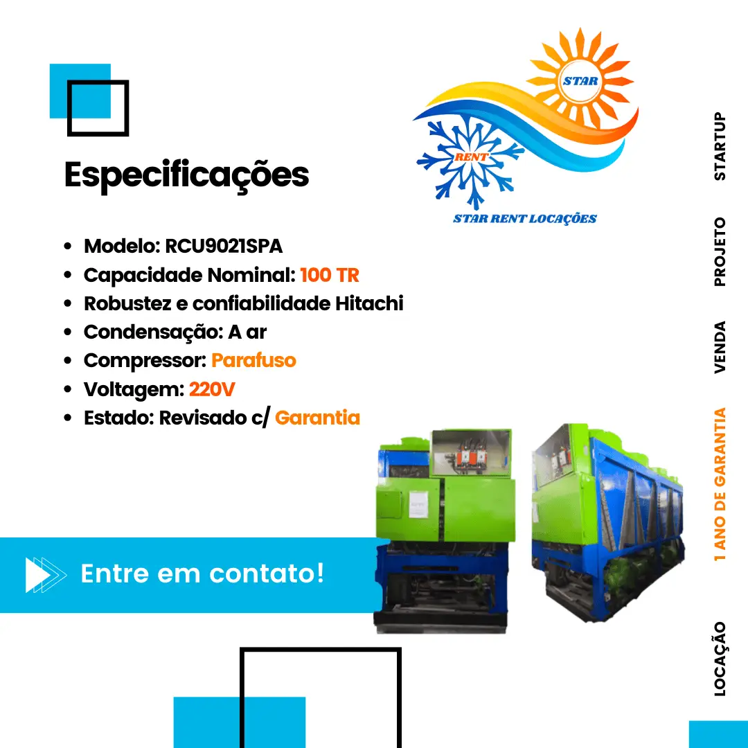 Paradas inesperadas no sistema de água gelada custam caro para a sua produção. O Chiller Hitachi 100 TR (RCU9021SPA) é a solução ideal para indústrias que buscam a reconhecida robustez da engenharia japonesa aliada à agilidade que só a Star Rent oferece. Disponível para locação ou compra, este equipamento foi 100% revisado pela nossa equipe de engenharia e está pronto para ser despachado, garantindo que sua operação volte à capacidade máxima em tempo recorde.